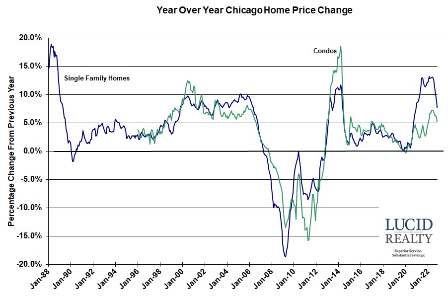 The title of this post could just as easily have been: Chicago Area Home Price Growth Falling Off A Cliff. Check out the graph below which incorporates the latest data from the November Case Shiller home price index released this morning. On a year over year basis Chicago area single family home prices still rose at a healthy clip – 7.7% to be exact – but that’s way down from the peak of 13.1% back in June and almost at a 2 year low. But what is interesting is that home prices in the rest of the country, which rose at a much faster rate over the last couple of years, are now falling faster than the Chicago area. Consequently, Chicago now ranks 7th out of 20 metro areas in terms of annual appreciation. That’s up from 9th place when the Case Shiller indices were released last month and up from near the bottom of the list over much of the last 2 years. At this point both the 10 and 20 city composite indices are running below Chicago at 6.3% and 6.8% respectively and the national average is the same as Chicago. Condo price appreciation is also pulling back and is now down to 5.2%.