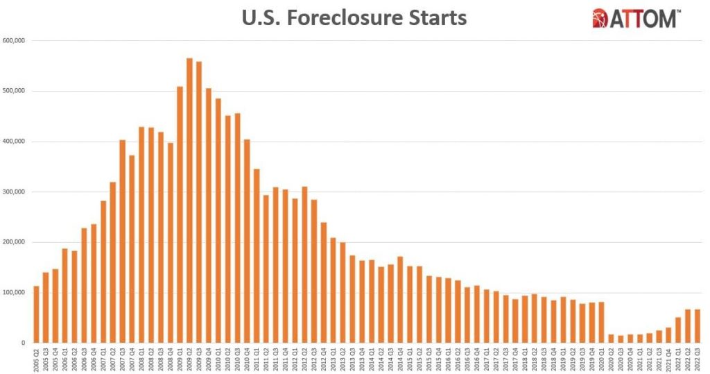 The Q3 2022 U.S. Foreclosure Market Report from ATTOM came out last week showing that the nation’s foreclosure activity has still not returned to pre-pandemic levels while the story for Chicago is a bit different. Foreclosure starts across the nation have risen considerably since the moratorium expired but they still fall a bit shy of where we were in the first quarter of 2020.