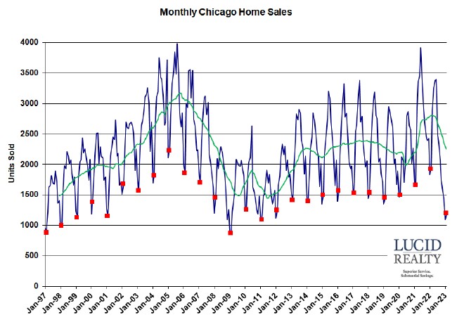 Yeah, the Chicago real estate market had another down month in February BUT not quite as bad as the last two months. Home sales were down only 35.8% from the previous year compared to 40%+ the previous two months. Had it not been for the extraordinary low of February 2011 this would have been a 14 year low. In fact, over the last 22 years only two years had lower sales. However, as I explain below this isn’t as bad as it may sound.
