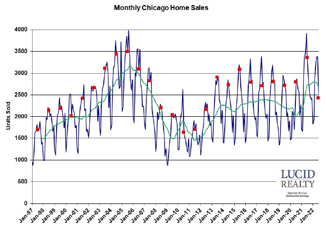 Up until the Chicago real estate market update for June there were signs on the horizon of the market slowing down but closings were still looking pretty good. We knew it couldn’t last and, sure enough, the market cratered in July. Closings were down 25.9% from last year. Once again, that was the biggest drop in 2 years but, since the last 2 years were distorted by Covid culture, let’s compare it to 2019. July was down 8.6% from then and, as you can see in the graph below, it was also the lowest sales level in 10 years.